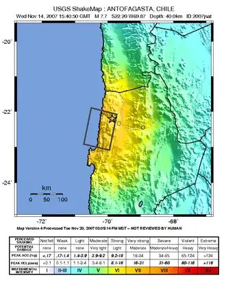 The 2007 Tocopilla earthquake occurred on November 14 at 12:40:50 local time. Its epicenter was located between Quillagua and Tocopilla, affecting the Tarapacá and the Antofagasta regions in northern Chile. The earthquake had a moment magnitude of 7.7 and lasted about 3 minutes and 35 seconds.[4] Seventeen aftershocks of magnitude greater than 5.3, including one of magnitude 7.1 and two others of magnitude 6.3 or higher, were recorded.[5] The Pacific Tsunami Warning Center issued a tsunami warning, stating a tsunami had been generated; after one hour, this warning was cancelled.[6][7] The earthquake was felt from Santiago, 1,245 km south from the epicenter, to La Paz, about 700 km north-northeast.[8]