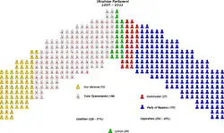 After the election various factions were formed in parliament. It was possible for 15 or more deputies to form a parliamentary faction (a lawmaker could join only one faction; the chairman and his two assistants could not head factions of deputies).[25][26][27][28][29] hence not all parties represented in the Verkhovna Rada had their own faction.[30] Factions are colored raspberry.[30]