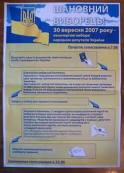 Early parliamentary elections were held in Ukraine on 30 September 2007. The election date was determined following agreement between the President Viktor Yushchenko, the Prime Minister Viktor Yanukovych and the Chairman of the Verkhovna Rada (Ukrainian Parliament) Oleksandr Moroz on 27 May 2007, in an attempt to resolve the political crisis in Ukraine triggered by the 2 April 2007 presidential decree on dissolution of Ukraine's parliament.[2][3]