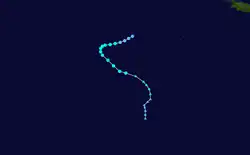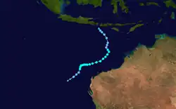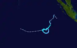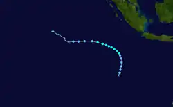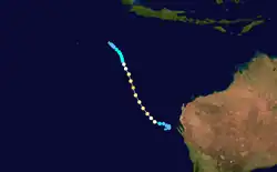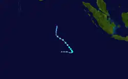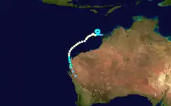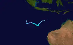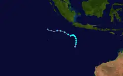 On 4 February, the Tropical Cyclone Warning Centre (TCWC) in Perth identified a Tropical Low South west of Christmas Island, and began issuing shipping warnings.[39] Initially it was predicted that the system would intensify into a tropical cyclone but later on 4 February, the cyclone began to weaken with the final gale warnings being issued by TCWC Perth later that day. Over the next few days the system drifted eastwards and then on 6 February began showing signs of intensification.[40] The following day, the Joint Typhoon Warning Center (JTWC) issued its first advisory, designating the low as Tropical Cyclone 17S.[41] Later that day TCWC Perth reinstated Gale warnings on the tropical low.[40] On 10 February The TCWC Perth and the JTWC issued their final advisories on the system.[42]