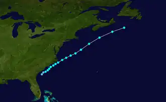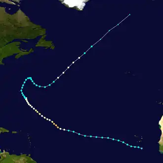 A well-defined tropical wave left Africa on July 1 and organized into a tropical depression by 06:00 UTC on July 3. Six hours later, it intensified into Tropical Storm Bertha, the easternmost tropical storm on record in the Atlantic during July. Steered on a west-northwest or northwest course, Bertha reached hurricane strength around 06:00 UTC on July 7. The cyclone then underwent a period of rapid intensification that brought it to its peak as a Category 3 hurricane with winds of 125 mph (201 km/h) later that day. Structural changes and a more hostile environment caused the storm to fluctuate in intensity as it passed east of Bermuda. By July 19, however, the storm began to undergo extratropical transition, a process it completed by 12:00 UTC the next morning. The post-tropical storm continued northeast and merged with a larger extratropical low near Iceland on July 21. Lasting a duration of 17 days, Bertha became the longest-lived Atlantic tropical cyclone on record during the month of July.[41]