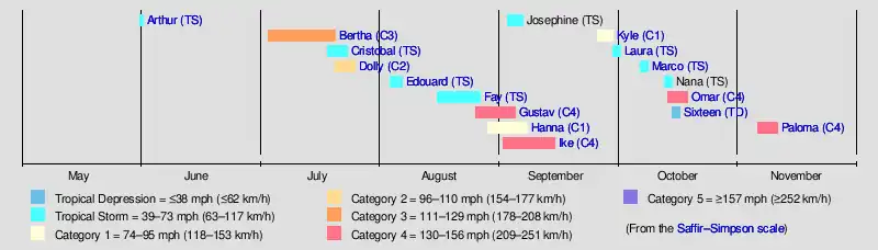 Hurricane PalomaOctober 2008 Central America floodsHurricane OmarTropical Storm Marco (2008)Tropical Storm Laura (2008)Hurricane Kyle (2008)Hurricane IkeHurricane Hanna (2008)Hurricane GustavTropical Storm Fay (2008)Tropical Storm Edouard (2008)Hurricane Dolly (2008)Tropical Storm Cristobal (2008)Hurricane Bertha (2008)Tropical Storm Arthur (2008)Saffir–Simpson scale