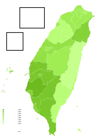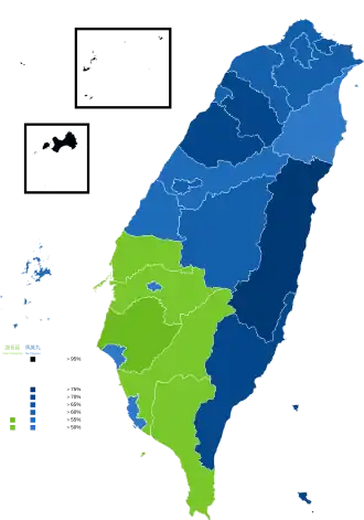 Chiayi County 427,808 166,833 54.44% 139,603 45.56% 2,936 72.32% -27,230