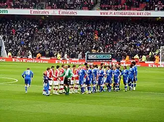 ![]() Arsenal and Everton players shake hands before their Premier League game at the Emirates | ||||