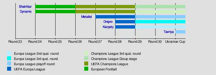 - Metalist Kharkiv's 4–1 away victory over Zorya Luhansk in the 29th Round secured them a third-place finish in the competition and a place in the Europa League play-off round. Also in the same round, Dnipro Dnipropetrovsk completed a 4–1 home victory against Illichivets which secured fourth-place and entry into Europa League third qualification round, since Karpaty Lviv lost 0–2 at home to Kryvbas Kryvyi Rih, leaving them in fifth place and qualification into the second qualification round.