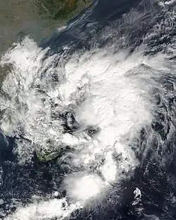 Early on September 3, the IMD reported that an area of low pressure had formed embedded within the monsoon off the Orissa coastline.[21] During the next day it developed further with the IMD reporting that the low-pressure area had become well marked with deep convection starting to consolidate around a developing low level circulation center in an area of moderate vertical wind shear.[22][23] Early on September 5, as the area of low pressure was moving into an area of low vertical windshear the JTWC issued a Tropical Cyclone Formation Alert, whilst the IMD reported that the low-pressure area had intensified into a Depression.[24][25] Later that day the IMD reported that the depression had intensified further and had become a Deep Depression, whilst the JTWC designated the depression as a Cyclone 03B, with winds equivalent to a tropical storm.[26][27] However the JTWC's first warning was also their final warning as the cyclone had made landfall near Digha in West Bengal and was expected to dissipate later that day.[27][28] However the IMD kept issuing advisories on the deep depression until early on September 7, when the IMD reported that it had weakened into a depression and then into a well marked low-pressure area later that day when they stopped issuing advisories on the depression whilst it was located over Jharkhand and adjoining region of Chhattisgarh.