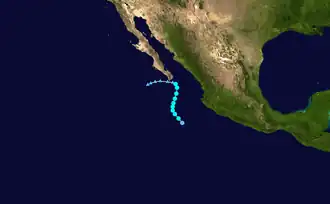 A tropical wave exited the western coast of Africa on June 19, which moved westward across the Atlantic without development. By June 29, the wave crossed Central America into the eastern Pacific. Thunderstorms increased over the next several days, which organized into curved rainbands around a developing low-pressure area on July 4. Following further organization, the system developed into a tropical depression on July 6, located roughly 435 miles (700 kilometres) south of Cabo San Lucas, Mexico. Soon after, it strengthened into Tropical Storm Blanca.[25] Operationally, the NHC classified the system immediately as a tropical storm. At that time, Blanca developed an eye-feature, though it was not expected to develop into a hurricane.[26] Steered by a ridge to the north, the storm moved west-northwestward throughout its existence.[25] Early on July 7, Blanca attained peak winds of 50 mph (80 km/h) and a barometric pressure of 998 mbar (hPa; 29.47 inHg).[25] The storm's convection developed into a central dense overcast over the center,[27] which soon began deteriorating, with cloud tops warming and convection shrinking.[28] By late on July 7, the center became devoid of shower and thunderstorm activity,[29] with only intermittent convection.[30] On July 8, Blanca weakened into a tropical depression, and the next day it degenerated into a remnant low. Although no longer a tropical cyclone, the remnants of Blanca maintained a well-defined low pressure center as it continued its northwesterly movement. Early on July 11, the system turned northward and gradually weakened. By the following day, Blanca had dissipated over open waters.[25]