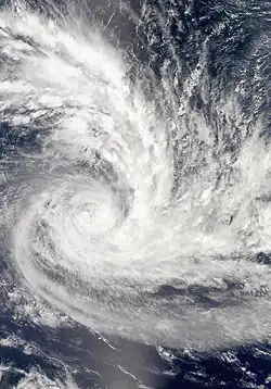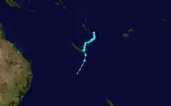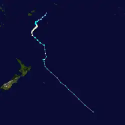 Early on February 13, RSMC Nadi reported that Tropical Disturbance 11F had formed about 65 km to the southwest of Port Vila in Vanuatu.[91] During the next day, the system gradually moved north and started intensifying.[92] Late on February 16, the disturbance turned south-southeast and intensified into a Tropical depression.[93] On the next morning, organization in the system improved, but the convection decreased unexpectedly.[94] Early on January 18, deep convection started developing over the Low-level Circulation Center (LLCC) which is very favorable for Tropical cyclogenesis.[95] Late on that day, the JTWC started monitoring the system as Tropical Cyclone 17P.[96] Early on the next day, RSMC Nadi upgraded the depression into a Category 1 Tropical Cyclone and named it Atu.[97] At midnight, that day, RSMC Nadi upgraded Atu into a Category 2 tropical cyclone,[98] and six hours later it was upgraded again into a Category 3 severe tropical cyclone,[99] and then again into a Category 4 Severe Tropical cyclone.[100] Though Atu strengthened rapidly, it weakened unexpectedly on the next day because of an eyewall replacement cycle.[101] Early on February 23, Atu crossed 25°S and entered TCWC Wellington's area of responsibility as a Category 3 Severe Tropical Cyclone.[102] Late on that day, the JTWC, reporting that the system was becoming extratropical, issued their final warning on Atu.[103] At midnight, that day, TCWC Wellington reported that Atu was no longer a Severe Tropical Cyclone.[104] Within six hours, TCWC Wellington downgraded Atu into a low, no longer considering it tropical.[105]