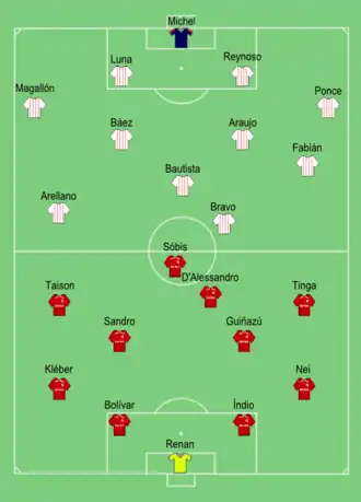 The first leg of the finals was seen by 49,500 spectators although they weren't all seated by the time Baldassi blew his whistle.[5] The first 15 minutes started with Internacional dominating the match, as Chivas struggled to create any rhythm.[5] Chivas subsequently started to settle into their play and knocked the ball around fluently, but struggled to find an entrance against a dogged Colorado backline.[5] The away side on the other hand continued to threaten out wide, and came close to scoring on the half-hour when Taison was pulled down on the edge of the area.[5] Then, Alecsandro's free kick saw the ball hit the bar and bounce out of play.[5] The Mexicans did manage to test Renan for the first time shortly after, the Internacional keeper reacting smartly to cut off Omar Bravo when the striker was played through behind the defence.[5] The Colorados suffered a setback when striker and top scorer Alecsandro hobbled off injured to be replaced by Everton, but the Porto Alegre outfit continued looking the more dangerous team.[5] With the last touch of the half however, Chivas struck against the run of play.[5] The Mexican midfield combined smartly on the edge of the area to release Marco Fabián, and his chipped pass found Adolfo Bautista; the midfielder looped a header in from outside the area, leaving the Inter keeper scrambling back in vain.[5]