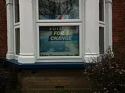 The governing Labour Party campaigned to secure a fourth consecutive term in office, and to restore support lost since 2001 due to the Iraq War.[8] The Conservative Party sought to gain a dominant position in British politics after losses in the 1990s, and to replace Labour as the governing party. The Liberal Democrats hoped to make gains from both sides and hoped to hold the balance of power in a hung parliament. Since the televised debates between the three leaders, their poll ratings had risen to the point where many considered the possibility of a Liberal Democrat role in Government.[9] Polls just before election day saw a slight swing from the Liberal Democrats back to Labour and Conservatives, with the majority of final polls falling within one point of Conservatives 36%, Labour 29%, Liberal Democrats 23%.[10][11] However, record numbers of undecided voters raised uncertainty about the outcome.[12][13] The Scottish National Party, encouraged by their victory in the 2007 Scottish parliament elections, set itself a target of 20 MPs and was hoping to find itself holding a balance of power.[14] Equally, Plaid Cymru sought gains in Wales. Smaller parties which had had successes at local elections and the 2009 European elections (UK Independence Party, Green Party, British National Party) looked to extend their representation to seats in the House of Commons. The Democratic Unionist Party looked to maintain, if not extend, its number of seats, having been the fourth-largest party in the House of Commons.