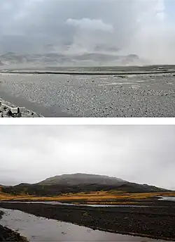 On 22 March, a flow meter device in the Krossá glacial river (which drains Eyjafjallajökull and Mýrdalsjökull glaciers) in the Þórsmörk area (a few kilometres north-west of the erupting location) started to record a sudden rise in water level and water temperature – the total water temperature rose by 6 °C (11 °F) over a two-hour period, which had never happened so quickly in the Krossá river since measurements began. Shortly afterward, the water level returned to normal and water temperature decreased.[34] This rise in water temperature was thought to be related to the eruption nearby and was affecting part of the Krossá drainage basin. The temperature of Hruná river, which flows through the narrow Hrunárgil canyon, into which part of the lava stream was flowing, was recently recorded by geologists to be between 50 and 60 °C (122 and 140 °F), indicating that the river was cooling the lava in that canyon.[35]