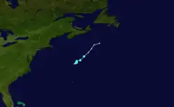 On July 17, an area of showers and thunderstorms, associated with the same frontal system that spawned Tropical Storm Bret, consolidated around a developing area of low pressure about 345 mi (555 km) west-southwest of Bermuda. Tracking east-northeastward, the system gradually organized and became better defined. The disturbance produced moderate rains while passing south of the territory, peaking at 1.16 in (29 mm); gusty winds were also observed. At 06:00 UTC on July 20, the low developed into a tropical depression east of Bermuda. Embedded within the mid-latitude westerlies, the depression moved northeast and maintained this general direction for the remainder of its existence.[40]