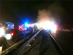 Property damage34 vehicles; road surface scorched, debris fused into road surface; safety barrier damage