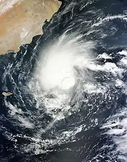 Under the influence of a low-level trough, a low-pressure area formed over the Arabian Sea in late October. The system organized and the IMD designated the system Depression "ARB 02".[35] The depression moved toward the Middle East during the next few days and intensified into a Deep Depression on November 1.[36] In the morning of November 2, IMD upgraded the deep depression into a cyclonic storm and assigned it the name Keila.