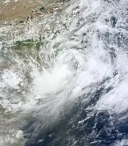Late on September 20, an area of low pressure developed approximately 200 nautical miles (370 km; 230 mi) south of Chittagong, Bangladesh.[22] Under the influence of strong vertical wind shear and monsoonal activity in the Bay of Bengal, the system was unable to strengthen and the JTWC later reported that the system had dissipated.[23] However, on September 22, the IMD started monitoring the system as a Depression and initiated bulletins on the system, designating it BOB 03.[24] Late on that day, BOB 03 drifted northwest and made landfall over north Orissa close to Balasore.[25] After moving further northwestwards, the depression remained practically stationary over Jharkhand. By the evening of September 23, IMD reported that the depression had weakened into a well-marked low-pressure area in their final bulletin for the system, as the storm dissipated to a remnant low.[26]