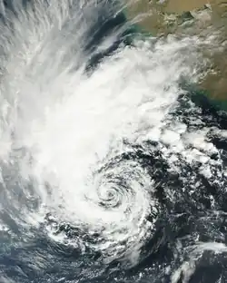 Early on December 28, the JTWC reported that Thane had become the equivalent to a category one hurricane on the SSHS before later that day the IMD reported that Thane had become the first Very Severe Cyclonic Storm of the season.[61][62] During December 28, Thane continued to intensify, and developed a small pinhole eye, before the JTWC reported that Thane had attained its peak intensity early on December 29 with 1-minute sustained wind speeds of 165 km/h (105 mph).[63][64] The IMD then followed suit and reported that the system had peaked as a Very Severe Cyclonic Storm with 3-minute sustained windspeeds of 140 km/h (85 mph).[65] During the rest of that day, the system continued to move westwards and weakened slightly as it started to interact with land. Thane then made landfall as a very severe cyclonic storm early on December 30 on the north Tamil Nadu coast between Cuddalore and Pondicherry.[66] After making landfall, Thane rapidly weaken into a depression before the JTWC issued their final advisory during December 30, while the IMD continued to monitor the remnants of Thane until the depression weakened into a well marked low-pressure area on December 31.[66]