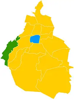 Results of the election for borough mayors. Blue: Victories by the PAN. Yellow: Victories by the PRD/PT/MC. Green: Victories by the PRI/PVEM.