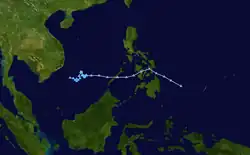 Early on February 17, the JMA reported that a tropical depression had developed, about 800 km (495 mi) to the southeast of Manila on the Philippine island of Luzon.[19] During that day the depression moved westwards, before the Joint Typhoon Warning Center initiated advisories at 1500 UTC and designated the system as Tropical Depression 01W.[20] However, six hours later the JTWC issued its final advisory as vertical windshear had started to increase, and after it had found no deep convection near the systems low level circulation centre during a reassessment of the depressions low level structure.[21] Over the next few days the JMA continued to monitor the depression before it was last noted during February 20.[22]