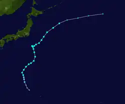 Late on the next day, the JTWC upgraded Sanvu to a category 1 typhoon, as an eye was seen on microwave imagery.[50] Late on May 24, the JMA upgraded Sanvu to a severe tropical storm.[51] Accelerating northeastward along the northwestern periphery of a subtropical ridge, the system reached its peak intensity by the next day, as its eye emerged on satellite imagery.[52][53][54] As its western quadrant got affected by a dry air entrainment on May 26, Sanvu started to weaken as it directly passed over Iwo Jima.[55] With strong vertical wind shear associated with a subtropical jet stream, along with rapidly cooling sea surface temperatures, the system continued to weaken.[56] The JTWC downgraded Sanvu to a tropical storm late on the same day, as the system's low level circulation center started to become exposed.[57] The JMA followed suit by the next day.[58] The JTWC subsequently issued their final advisory on Sanvu, as it commenced extratropical transition.[59] However, the JMA continued issuing advisories on Sanvu, until by the next day, when it fully transitioned into an extratropical cyclone.[60][61] The remnants of the system was last noted during May 30.[62]