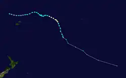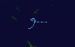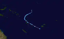During December 30, Freda continued to intensify further, before RSMC Nadi reported that Freda had peaked as a category 4 severe tropical cyclone with 10-minute sustained windspeeds of 185 km/h (115 mph).[40][44] The JTWC subsequently followed suit and reported that Freda had peaked with 1-minute sustained windspeeds of 205 km/h (125 mph) which made it equivalent to a category 3 hurricane on the SSHS.[45] After it had peaked, Freda started to quickly weaken as it continued to move towards the south-southeast, as vertical windshear over the system increased and caused convection over Freda's northern semicircle to gradually wear away.[46] By 0000 UTC on January 1, the JTWC reported that Freda had become equivalent to a category one hurricane, while RSMC Nadi had reported that the system had weakened into a category 2 tropical cyclone.[45][47] Throughout that day, Freda continued to weaken before at 1800 UTC after deep convection had become displaced to the east of the low level circulation center, RSMC Nadi reported that the cyclone had weakened into a tropical depression.[48] During the next day the JTWC issued their final advisory on the system after the low level circulation center had become fully exposed before the remnant tropical depression crossed the northern part of New Caledonia's Grande Terre Island.[40][49][50] After crossing New Caledonia's biggest island, Freda started to move towards the southeast between Grande Terre and the Loyalty Islands, while the JTWC reported that Freda had become a subtropical cyclone, as it was positioned under a strong subtropical westerly flow.[45][51] The remnant depression was subsequently last noted during January 4, as it dissipated about 630 km (390 mi) to the southwest of Nadi, Fiji.[45][52]