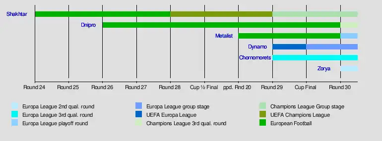 - After the 29th Round, Dynamo Kyiv qualified the 2014–15 UEFA Europa League.[53]