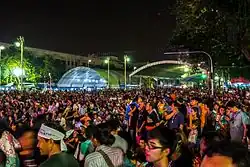 The Pheu Thai Party rejected the decision, claiming that the court had no jurisdiction over the case,[62] earning the Constitutional Court the nickname "San Khrai Fang" (ศาลใครฟัง; "court heeded by no one").[63] Although her party ignored the court decision and asserted the legality of the draft amendment, Yingluck withdrew the draft from King Bhumibol Adulyadej on 8 December 2013 before the King signed it into law.[64] The Pheu Thai Party's denial of the court decision resulted in anti-government protest numbers swelling over the following weekend of 23–24 November 2013, with at least 100,000 protesters gathering at the Democracy Monument on Ratchadamnoen Avenue. Protest leaders claimed up to a million people joined the rally. The UDD-led Red Shirts, who had reconciled with the government after the amnesty bill was dropped and had been rallying its supporters at Rajamangala Stadium prior to the court decision, also resumed their counter-protest, with about 40,000 supporters arriving on 24 November.[65]