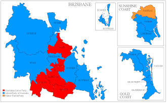 The following tables show state-by-state results in the Australian House of Representatives at the 2013 federal election, Coalition 90, Labor 55, Australian Greens 1, Palmer United Party 1, Katter's Australian Party 1, with 2 independents.[1]