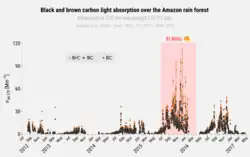 56. ^ Saturno, Jorge; Holanda, Bruna A.; Pöhlker, Christopher; Ditas, Florian; Wang, Qiaoqiao; Moran-Zuloaga, Daniel; Brito, Joel; Carbone, Samara; Cheng, Yafang; Chi, Xuguang; Ditas, Jeannine; Hoffmann, Thorsten; Hrabe de Angelis, Isabella; Könemann, Tobias; Lavrič, Jošt V. (6 September 2018). "Black and brown carbon over central Amazonia: long-term aerosol measurements at the ATTO site". Atmospheric Chemistry and Physics. 18 (17): 12817–12843. Bibcode:2018ACP....1812817S. doi:10.5194/acp-18-12817-2018. hdl:11858/00-001M-0000-002E-89B6-D. ISSN 1680-7324.
