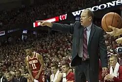 The 2015–16 Wisconsin Badgers men's basketball team represented the University of Wisconsin–Madison in the 2015–16 NCAA Division I men's basketball season. This was Bo Ryan's 15th season as head coach at Wisconsin, before he resigned 12 games into the season. On December 15, 2015, Ryan announced he would retire effective immediately leaving associate head coach Greg Gard as interim head coach. The team played their home games at the Kohl Center and were members of the Big Ten Conference. They finished the season 22–13, 12–6 in Big Ten play to finish in a four-way tie for third place in conference. Shortly after the regular season, Greg Gard had the interim tag removed as he was announced as the permanent head coach.[1] The Badgers were upset by Nebraska in the second round of the Big Ten tournament. They received an at-large bid to the NCAA tournament, their 18th straight appearance in the Tournament. They defeated Pittsburgh and Xavier to advance to the Sweet Sixteen for the third consecutive year. In the Sweet Sixteen, they lost to Notre Dame.
