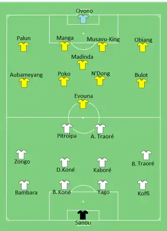 Congo took the lead in the 51st minute, when Férébory Doré crossed for Thievy Bifouma to convert from close range. Burkina Faso equalized in the 86th minute, after Aristide Bancé scored from Issiaka Ouédraogo's cross, but Congo retook the lead one minute later, as from a Congo free kick, Burkina Faso goalkeeper Germain Sanou punched the ball and it hit Fabrice Ondama and went into the net. As a result, Congo qualified as group winners while Burkina Faso were eliminated.[17][18]