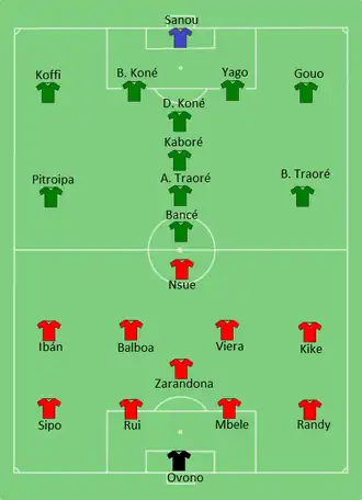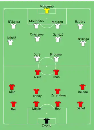 The first goal of the tournament was scored by Emilio Nsue. Receiving a through ball from Kike, he slotted the ball low past the goalkeeper with his right foot from six yards out to open the scoring for the hosts after 16 minutes. Thievy Bifouma scored the equalizer for Congo with three minutes left, after being played in by Dominique Malonga, he slotted it low into the net from the right of the six yard box.[2][3]