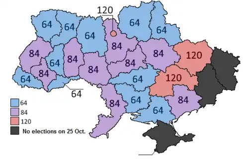 A proposition of the minimum number of deputies in a local council was to be 10 in places were the number of voters does not go above 500.[29] The maximum number of Deputies in a council is 80 in places with more than 1.5 million voters.[29] However, the proposition was not passed and the composition of local councils was preserved according to the law originally adopted on 14 July 2015.[30] According to the article 16 the composition of local council is defined by the number of voters which is set at a minimum 12 deputies for up to 1,000 voters and a maximum 120 deputies for over 2 million voters.[30] The composition of the Supreme Council of Autonomous Republic of Crimea is defined by the Constitution of Autonomous Republic of Crimea.[30]
