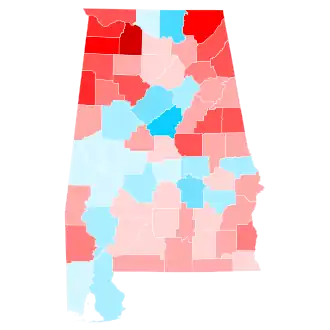 Alabama has voted for the Republican candidate in every election since it was won by Ronald Reagan in 1980. As such, Trump was heavily favored to win the state. On the day of the election, Trump won the election in Alabama with 62.08% of the vote, while Clinton received 34.36% of the vote.[3] The state had given 60.55% of its votes to Republican nominee Mitt Romney in 2012, meaning that it had shifted 1.53% more Republican from the previous election. Trump's margin of victory in Alabama was 27.72%, a 5.53% increase from Romney's 22.19% margin of victory. Alabama did not swing particularly hard to the right, as its white voters without college degrees were already extremely Republican.[4]