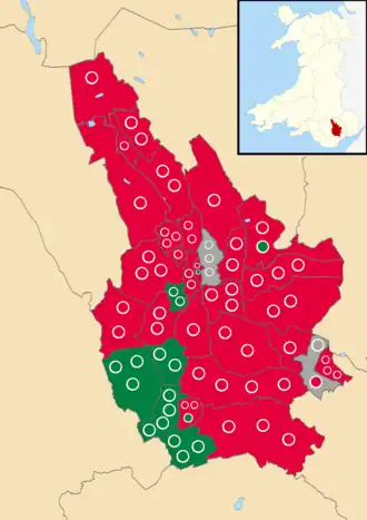 The Labour Party won 50 seats achieving a majority, Plaid Cymru obtained 18 seats and 5 seats were won by independent candidates. One seat (Twyn Carno ward) was elected unopposed.