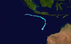 On 3 January, a tropical low had developed to the southwest of Sumatra.[26] On 06:00 UTC of 5 January, TCWC Perth began issuing advisories on the system, using the identifier 08U.[27] TCWC Perth had recorded winds of 75 km/h (45 mph), despite the fact that the system did not have the structure of a tropical cyclone.[27] By the next day, 08U then strengthened into a Category 1 tropical cyclone, with the storm receiving the name Irving, the fourth named storm of the season.[28] Three hours later, the JTWC followed suit and gave the system the designation 04S.[29] TCWC Perth, however, discontinued advisories after Irving exited the basin on 12:00 UTC the same day.[30]