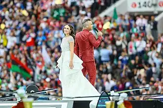 British pop singer Robbie Williams took centre stage at the end of the ceremony with a rendition of "Let Me Entertain You" before Russian soprano Aida Garifullina was carried out on to the pitch on the back of a "firebird" float. Williams sang a section of "Feel" before he and Garifullina performed a duet of "Angels" as performers emerged, dressed in the flags of all 32 teams and carrying a sign bearing the name of each nation. Williams then sang "Rock DJ" in an encore as the pitch was being cleared for the first match.[9]