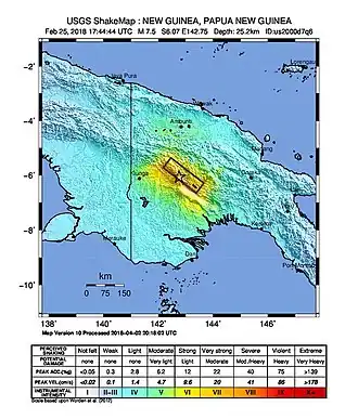 The Papua New Guinea earthquake was a magnitude 7.5 earthquake that occurred in the Hela Province of Papua New Guinea on 26 February 2018 (25 February UTC), at 3:44 a.m. local time (25 February, 17:44 UTC). The earthquake's epicenter was 10 kilometres (6.2 mi) west of the town of Komo. The maximum felt intensity was IX (Violent) on the Mercalli intensity scale.[2] A total of 160 people were killed and many others were injured.[3][4] An aftershock of M6.0 killed 11 people on 4 March,[5] while another aftershock of M6.7 occurred at 00:13 local time on 7 March,[6] killing at least 25 more.[7] A 6.3 aftershock killed another 4 people on 7 April, more than a month after the first tremors hit the area.