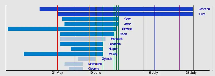 Johnson and Hunt, the final two candidates, were to be put to a vote of about 160,000 Conservative members, with the result to be announced in the week of 22 July.[134][135]