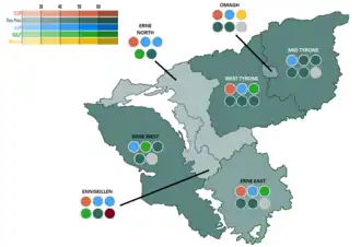 ![]() Fermanagh and Omagh 2019 Council Election Results by DEA (Shaded by plurality of FPVs) | |||||||||||||||||||||||||||||||||||||||||||||||||||||||||||||
