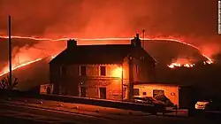 Later on the evening of 26 February a fire broke out on Saddleworth Moor in Oldham, Greater Manchester, rapidly spreading across 390 hectares (960 acres; 1.5 sq mi).[22] The same night saw approximately 800 square metres (0.20 acres; 960 sq yd) of gorse burn at Arthur's Seat in Edinburgh, prompting almost 200 calls to the emergency services.[23] By the morning of 27 February both fires were brought under control, though Public Health England advised residents of communities close to Saddleworth Moor to remain indoors and close windows to avoid inhaling smoke.[22] Though there were no reported injuries at Arthur's Seat,[23] concerns were raised over the fire's impact on rare species living at the site, such as the bordered brown lacewing, whose distribution across the United Kingdom comprised just one other site in Scotland.[24]