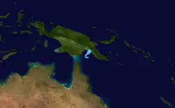 On 26 January, a low-pressure system formed to the east of the Solomon Islands, centred within a very long low-pressure trough stretching from Western Australia to the central South Pacific Ocean.[45][46] The low-pressure system tracked generally towards the west over the following days, moving into the Australian region from the South Pacific basin on 27 January.[47] On 3 February, a few days after the low-pressure trough had evolved into a monsoon trough,[48] the BOM noted that the low-pressure system had developed into a tropical low.[49] At the time, the atmospheric environment was assessed as being unfavourable for tropical cyclogenesis; however, the BOM indicated that conditions were likely to become more conducive over the following week.[49] The system moved eastwards onto the boundary of the region—the 160th meridian east—at approximately 06:00 UTC on 4 February,[50] before returning to the Australian region proper later that day.[51] By 06:00 UTC on 5 February, however, the system had moved eastwards out of the Australian region once again.[52] The system later intensified into a tropical cyclone while tracking southwards in the South Pacific basin, and was named Uesi by the Fiji Meteorological Service (FMS). Uesi reached peak intensity as a Category 3 severe tropical cyclone to the northwest of New Caledonia.