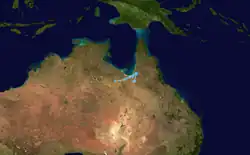 On 4 January, the BOM noted the formation of a weak tropical low over Indonesia's Maluku Islands.[22] In the ensuing days, the tropical low tracked slowly southeastwards across the Arafura Sea, towards the Gulf of Carpentaria. Significant development was hampered by strong vertical wind shear; however, very warm sea surface temperatures of up to 32 °C (90 °F) allowed the low to gradually increase in organisation.[23] On 7 January, shortly after the low passed near Cape Wessel in the Northern Territory, the BOM published their first forecast track map for the system, and issued a tropical cyclone watch for the northern coastline of Arnhem Land.[24] On the next day, the JTWC issued a Tropical Cyclone Formation Alert on the system as it began to organize just northwest of the Gove Peninsula.[25] As the system remained disorganized, the JTWC cancelled the first Tropical Cyclone Formation Alert, but later issued another one on 10 January as it re-organized itself, following land interaction with the Top End. It was later upgraded to a tropical cyclone by the BOM as it was northeast of Kalumburu, receiving the name Claudia on 11 January.[26] On the next day, the system was upgraded to a category 2 tropical cyclone. Several hours later, following a decrease in wind shear, Claudia's structure quickly improved, with the storm acquiring hurricane-force winds. It was then upgraded by the BOM to a severe tropical cyclone, during this intensification spell.[27]
