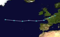 The first system of the season was Storm Lorenzo, when Met Éireann issued yellow wind warnings for Ireland and an orange warning for the western coastal counties.[10] The storm consisted of the remnants of Hurricane Lorenzo, which had turned extratropical.[11] The next named system was Amélie, named by Météo-France on 1 November.[12][13] Storm Bernardo was named next, by the Spanish meteorological agency, AEMET. This system primarily affected the Balearic Islands.[14] Cecilia was named next by AEMET, when the agency warned of rain and wind on the Iberian Peninsula and the Balearic Islands.[15]