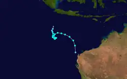 On 5 January, the Bureau of Meteorology (BOM) reported that a weak tropical low had formed within a trough over the eastern Indian Ocean, centred approximately 500 km (310 mi) northeast of the Cocos Islands.[115][116] Environmental conditions were assessed by the BOM as being unfavourable for significant intensification of the low, citing in particular the strong easterly winds in the upper troposphere that were forecast to develop by 10 January.[117] The tropical low meandered gradually southwards over the following days,[118] passing well to the east of the Cocos Islands on 8–9 January, around which time the system began to accelerate towards the west-southwest.[117][119] On 9 January, the Joint Typhoon Warning Center (JTWC) reported the development of formative convective rainbands wrapping into the tropical low's centre, and determined that environmental conditions were favourable for the system to strengthen, in contrast with the BOM's assessment. The JTWC noted the presence of strong poleward upper-level outflow, low vertical wind shear values and warm sea surface temperatures of 29–30 °C (84–86 °F).[120] By 05:00 UTC on 10 January, gale-force winds had developed in the southern quadrants of the tropical low, in part due to the fast translational velocity of the system towards the west-southwest.[119] The system's minimum atmospheric pressure was estimated at 1002 hPa (29.59 inHg) at that time.[121] Then, the system exited the basin towards the Southwest Indian Ocean on 10 January, before dissipating immediately thereafter, due to unfavourable high wind shear.