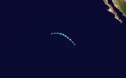 A tropical wave emerged off the west coast of Africa on June 20 and crossed into the East Pacific on July 3, where it interacted with the monsoon trough and began to organize. This system developed a defined surface low on July 6 and was classified as a tropical depression about 435 mi (700 km) south of Acapulco, Guerrero. Steered along a northwest trajectory by a mid-level ridge, the depression traversed a region of favorable conditions which enabled slow intensification.[28] Initial predictions from the NHC suggested significant strengthening of the cyclone.[29] However, Cristina instead encountered cooler waters and eventually drier air; it reached its peak intensity late on July 10 with winds of 70 mph (110 km/h) as it passed west of Socorro Island. Thereafter, the cyclone turned west along the south side of the subtropical ridge and steady weakened. The storm degraded into a remnant low around 18:00 UTC on July 12 and degenerated into a trough on July 15 about halfway between Hawaii and Baja California Sur.[28]