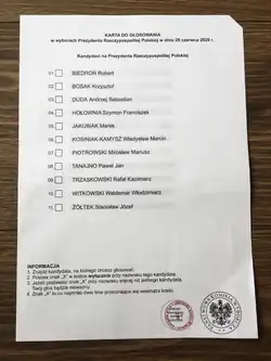 On 29 April 2020, 11 days before the planned election date, election candidate Stanisław Żółtek presented a copy of an electoral ballot at a press conference.[25][26] The copies contained the names of all the candidates and other forms to be filled by voters. Żółtek said that he received the ballots from workers of one of the companies that was printing and preparing electoral documents. Poczta Polska notified the Internal Security Agency about the leak. As of 2 May 2020, Polish law did not authorise Poczta Polska to organise postal voting except in a small number of special cases.[25]