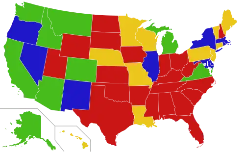 The rules for redistricting vary from state to state, but all states draw new legislative and congressional maps either in the state legislature, in redistricting commissions, or through some combination of the state legislature and a redistricting commission. Though various laws and court decisions have put constraints on redistricting, many redistricting institutions continue to practice gerrymandering, which involves drawing new districts with the intention of giving a political advantage to specific groups.[1] Political parties prepare for redistricting years in advance, and partisan control of redistricting institutions can provide a party with major advantages.[2] Aside from the possibility of mid-decade redistricting,[3] the districts drawn in the 2020 redistricting cycle will remain in effect until the next round of redistricting following the 2030 United States census.