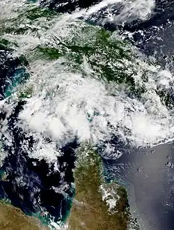 On 21 December, the BoM started to monitor a possible tropical low near the Arafura Sea.[46] Two days later, the BoM designated the low as 08U.[47] The JTWC started to monitor the system on 24 December.[48] By that same day, BoM began issuing advisories on the system, predicting a Category 1 intensity before landfall,[49] while the JTWC issued a TCFA at 21:00 UTC on the same day.[50] However, the TCFA was cancelled at 18:00 UTC on 25 December, since the system moved inland,[51] and the BoM ceased issuing advisories as well.[52] However, the tropical low kept moving eastward, reaching the Gulf of Carpentaria, before moving over the Top End and entering the Coral Sea.[4] At 02:30 UTC on 30 December, the JTWC issued a TCFA again on the system; however, at 02:30 UTC on 31 December, the TCFA was cancelled, due to the system developing subtropical characteristics.[53][54] Around that same time, the BoM upgraded the low to a Category 1 tropical cyclone on the Australian scale and named it Seth.[4] At 15:00 UTC, the JTWC finally classified it as a tropical cyclone, designating the system with the identifier 04P.[55] The cyclone reached its peak intensity that day, with BoM estimating Seth as a category 2 tropical cyclone, with sustained winds of 110 km/h (70 mph), before subsequently downgrading the storm to a category 1 tropical cyclone at 18:00 UTC that same day. At 06:00 UTC on 1 January, the BoM reclassified Seth as an ex-tropical cyclone.[4] The JTWC issued their final warning three hours later.[56] On the next day, the BoM classified the system as a subtropical low.[4]