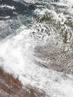 During the off-season, Tropical Cyclone Karim entered the basin on 7 May and did not pose a threat to land.[15] Another tropical low formed on 28 May, but remained disorganized due to wind shear and brought some rainfall to Western Australia.[16] After the season, the BoM noted that they found a separate circulation that was once considered a part of Tropical Low 34U. It developed on 25 April and tracked away to the east and dissipated the next day.[17]
