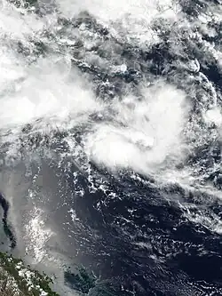 On 28 January, the BoM noted that a tropical low may form within a monsoon trough over the Coral Sea over the next few days.[77] By the next day, the agency reported that the low was forming about 250 km (160 mi) to the northeast of Cairns.[78] On 30 January, the JTWC started to monitor the low and gave it a low chance of formation into a tropical cyclone.[79] Under a favorable environment of warm sea surface temperatures, lowering wind shear and good outflow aloft, the system continued to consolidate, prompting the JTWC to issue a TCFA by the next day,[80][81] before subsequently upgrading it to a tropical cyclone, and designated it as 09P.[82] By 1 February, the BoM designated the low as 16U.[83] However, 16U did not intensify further as a dry air entrainment hampered the system's intensification, while continuing to move east-southeast under a near-equatorial ridge positioned to the north and northeast.[84] The JTWC later downgraded 16U into a tropical depression.[85] On 3 February, 16U exited the basin and entered the South Pacific basin.[86][17]